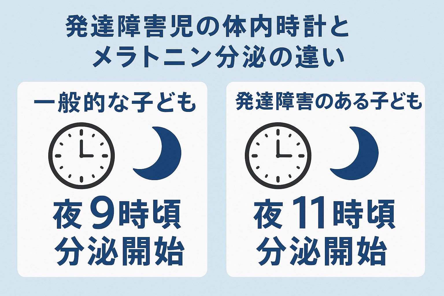 ところが、発達障害のあるお子さんの中には、このメラトニンが出始める時間が遅かったり、分泌される量が少なかったりする生物学的な特性を持つ子が少なくありません。「眠る準備が整うのに、ほかの子より少し時間がかかるタイプ」と言えるでしょう。