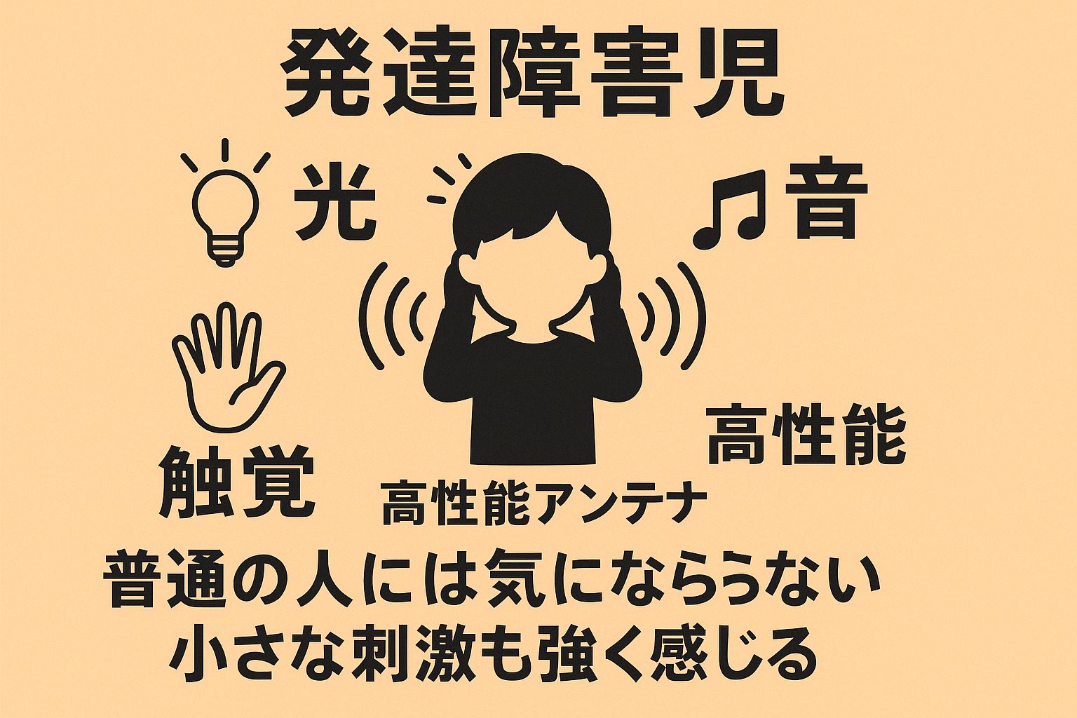 発達障害のあるお子さんは、五感が非常に繊細で、私たちが気にも留めないような小さな刺激を強く感じ取ってしまうことがあります。いうなれば高性能すぎるアンテナを常に張り巡らせているような状態です。