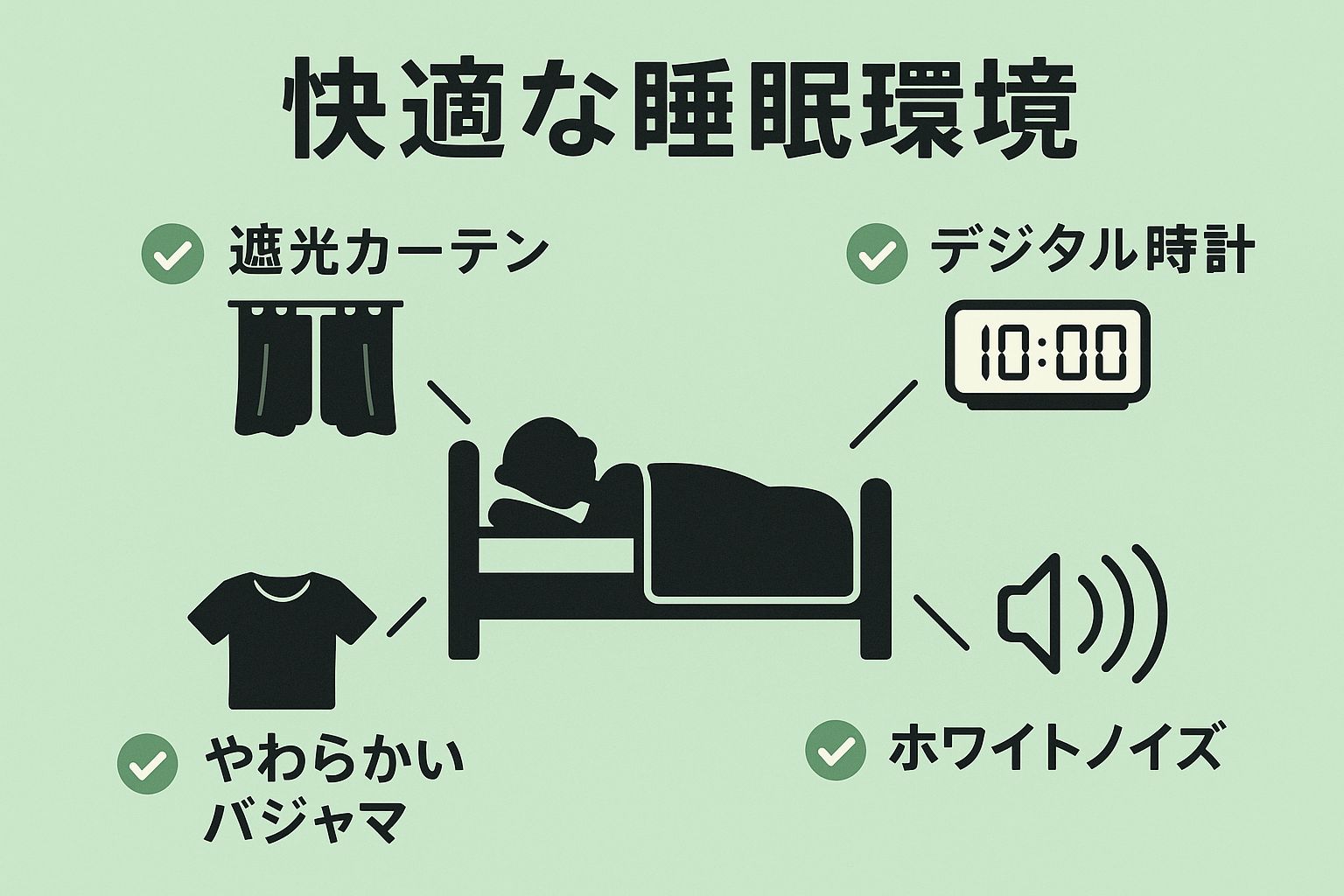 - 寝室環境の再点検: まずはステップ2で紹介した「光・音・肌触り」をもう一度チェックしてみましょう。特に室温は、夏も冬も快適な状態を保てているか確認が必要です。