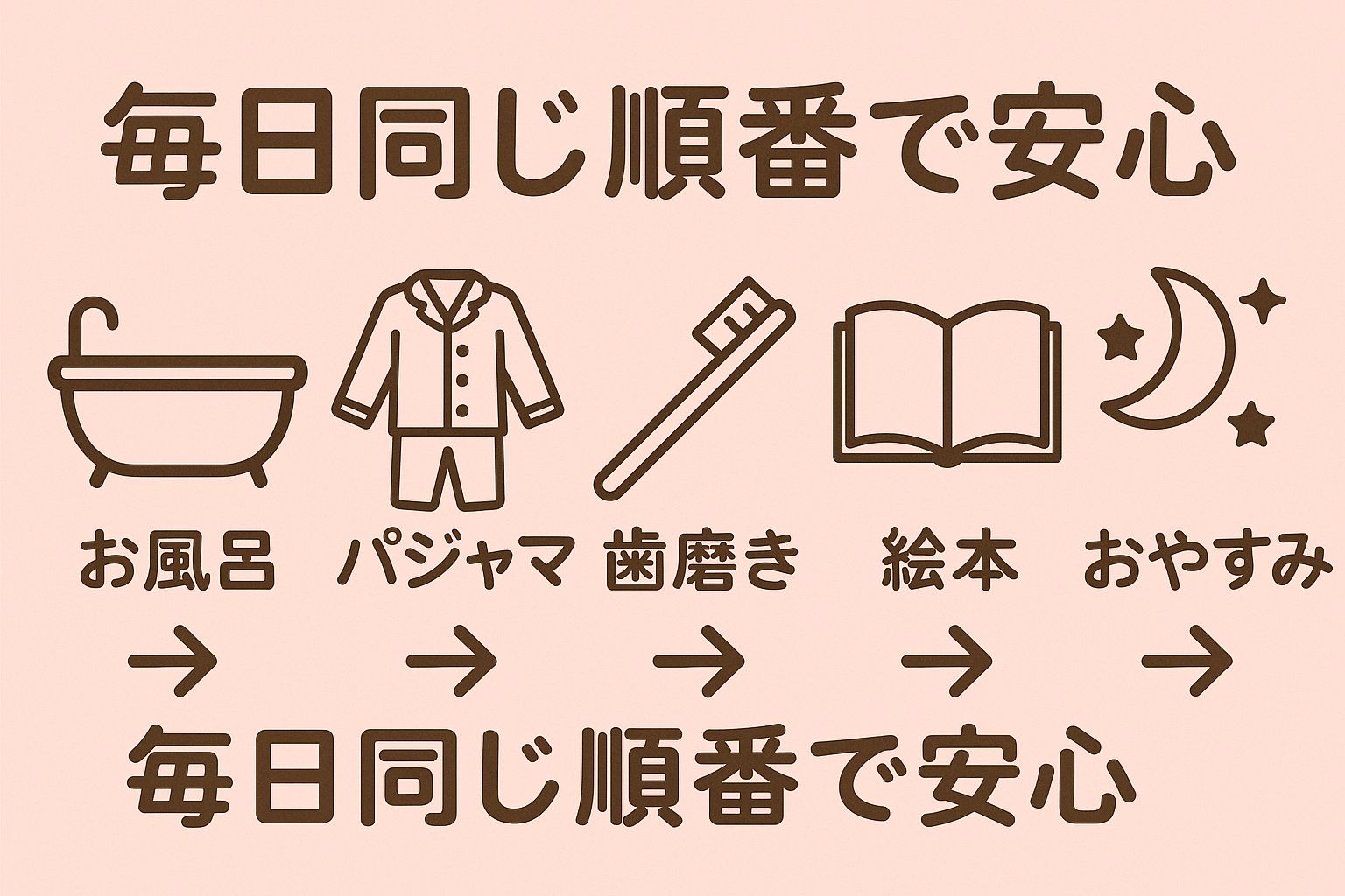 特に発達障害のあるお子さんにとって、「次は何が起こるかわからない」という状況は大きな不安につながります。毎日同じ時間に、同じ手順を繰り返す「入眠儀式」を行えば、「もうすぐ寝る時間だ」という安心のサインになり、スムーズな入眠を助けるのです。